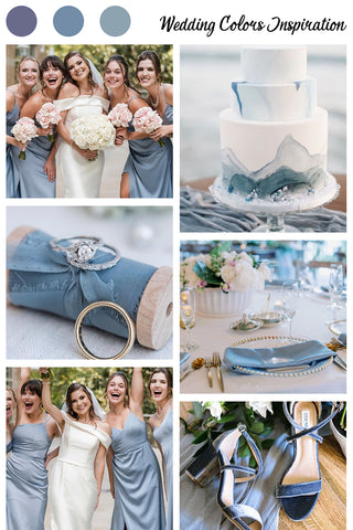 Il blu polveroso abbinato ad argenti, bianchi, grigi e lilla, crea facilmente l'ultimo fascino del paese delle meraviglie invernale. Questo look è servito al meglio in sale per banchetti riccamente decorate o forse in una capanna in montagna. Accentua il tuo abito da sposa con argento e blu polveroso e chiedi alle tue damigelle di indossare abiti di quei colori. Adorna i tuoi tavoli e le arcate con fiori polverosi blu, bianchi e lilla. Completa l'intero look per il tuo matrimonio.