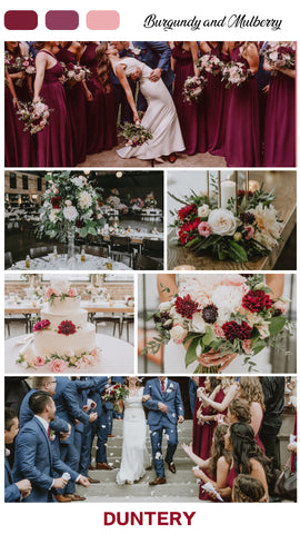 Un bouquet riccamente colorato in bordeaux e rosso si staglia contro un abito da sposa bianco. Adorna un arco circolare con una vegetazione lussureggiante e fiori cremisi e bianchi per un look industriale rinfrescato da un tocco da giardino. Seleziona il bordeaux o qualcosa di rosso per la tua squadra di sposi, che aggiungerebbe un altro senso di celebrazione delle vacanze al tuo grande giorno.