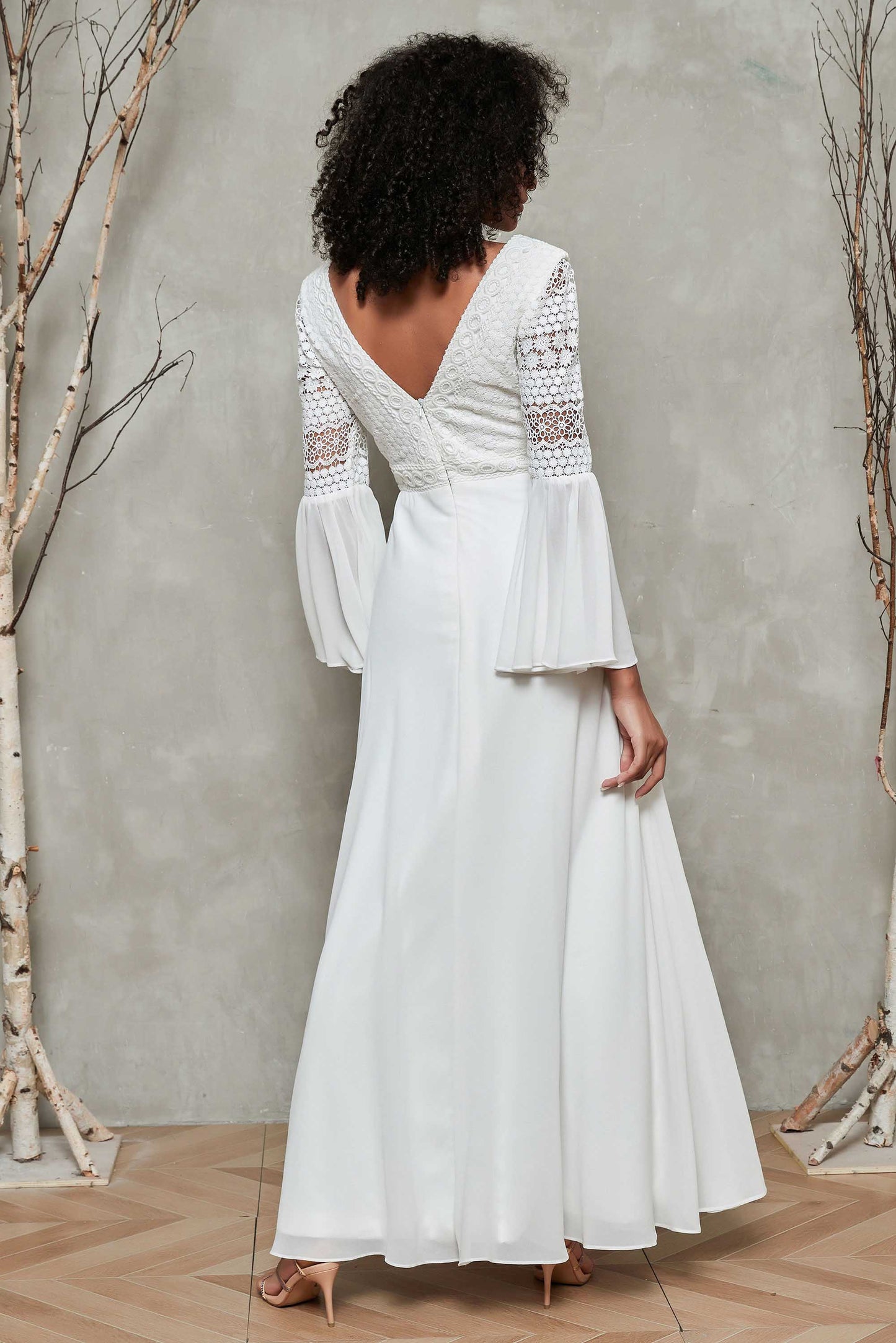 Michelle è uno splendido abito da sposa A-line in chiffon. L'intrigante scollo a V e la schiena aperta valorizzeranno sia la parte anteriore che la schiena. Le maniche lunghe hanno dettagli ricchi e raffinati, e anche molto sexy. Sarai senza dubbio elegantissima con questo vestito!